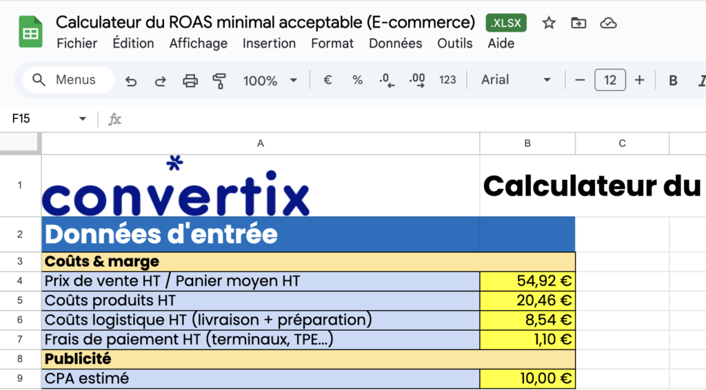Ce fichier te permettra de calculer ton ROAS minimal acceptable sur Google Ads et Meta Ads si tu es un e-commerce. Il intègre plusieurs variables pour un calcul précis et actionnable :
